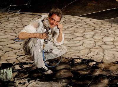 Amat, en la escena, como director y escenógrafo, ha proporcionado a ese encuentro entre Goytisolo y Sánchez Verdú una plasticidad inquietante, entre kitsch y volcánica, pero sobre todo una luz a la que dirigirse, eso sí, dejando que el espectador se extravíe un poco, para encontrarse mejor. "El viaje es eso. La experiencia del viaje invita al éxtasis, a trasladarse a otro lugar, sin cuaderno de bitácora, sin guía", cuenta el artista después de haberse presentado embadurnado de pintura hasta los carrillos. Acaba de repasar, en mono de faena y a pistolazo limpio, los cráteres de un paisaje volcánico por el que pulularán los cantantes, con el barítono Dietrich Henschel, la soprano Ofelia Sala, el contratenor Carlos Mena o la voz imponente de Marcel Pérès al frente del reparto, y la dirección musical de Jesús López Cobos.