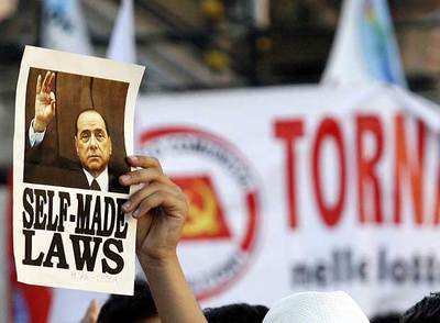 La manifestación ha sido convocada por Antonio di Pietro, ex juez del proceso Manos Limpias y líder del grupo Italia de los Valores, que incendia la plaza con su verbo agresivo: "Hay que resistirse y rebelarse, esto es una dictadura dulce", dice. En la plaza, unas 15.000 personas portan banderas y pancartas de todos los colores. El cómico Beppe Grillo, fundador del movimiento Vaffanculo, comparece vía vídeo con su mensaje antipolítico. El artículo 3 de la Constitución ("Todos los ciudadanos tienen igual dignidad social y son iguales ante la ley, sin distinción de sexo, raza, lengua, religión, tendencia política, condición personal o social") preside el escenario.