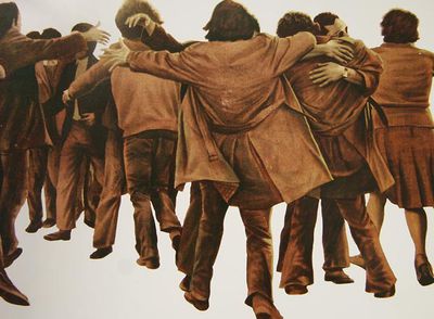 Una obra de Juan Genovés pintada en 1976, El abrazo, resume perfectamente el espíritu de la espectacular exposición La huella de la fotografía en la nueva pintura realista. La aportación valenciana (1963-2005), que ayer se inauguró en el Centre de El Carme de Valencia. Resume una época, en la que hubo una reacción artística frente al informalismo imperante para volver los pinceles hacia la figuración. Resume también cómo esa figuración, en el caso de los artistas valencianos, estuvo muy influenciada por el pop art, y a su vez con una indisimulada vocación política y social. No en vano se expone en el Reina Sofía de Madrid como icono de la transición. Y sobre todo resume la poderosa influencia de la fotografía en una corriente que en principio la "convierte en un material documental pero paulatinamente la usa como el propio soporte técnico", en palabras de la comisaria Felisa Martínez.