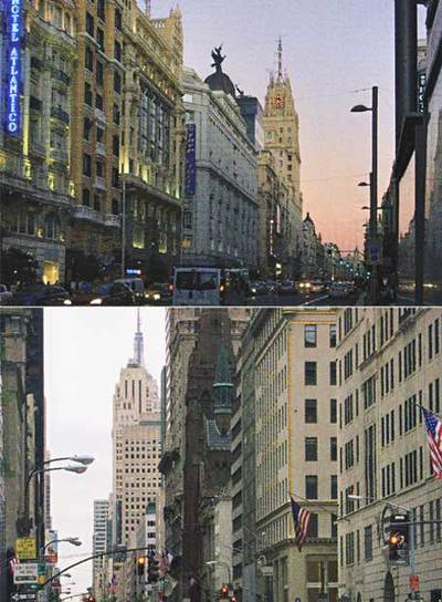 Las dos son ciudades caóticas: Nueva York, por su decrepitud y el estado deplorable de sus servicios públicos; Madrid, por el exceso de intervenciones urbanísticas y su estructura de poblachón. Pero sus calles son pisadas, usadas, maltratadas y bendecidas de tal manera por millones de personas que hay una suerte de vitalidad contagiosa común. Son ciudades insomnes, de bulla, proclives al jaleo y a la agitación verbal; urbes donde la gente habla alto, ríe sonoramente, comenta en alto. En un primer momento, los que vienen de fuera se sienten intimidados, porque el tono general es directo, imperioso, mandón. Antes de que los restaurantes de Nueva York fueran invadidos por esos estudiantes de teatro que te recitan la carta con gran falsedad interpretativa, los camareros se parecían enormemente a los viejos camareros de Madrid, que te despachan con ese célebre ¿Qué? que te deja helado hasta que intuyes que más allá de la rudeza hay una calidez escondida. Aún hoy, en los antiguos diner, uno puede ser atendido por viejas y viejos camareros y encontrar un encanto a ese trato tan seco como familiar.