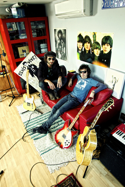 Paredes blancas, solo manchadas por pósteres de los Beatles o Elvis. Instrumentos musicales: pianos, guitarras acústicas, eléctricas, panderetas -"nada hay tan imprescindible en un estudio de grabación como una pandereta"-, bottle necks, púas amarillas por el suelo... La lógica y clásica imaginería que circunda a una banda de rock en el sitio donde brotan sus riffs: "El disco Aviones lo hicimos aquí, sin toda la movida que hay en el centro. Trajimos las guitarras y a nuestro técnico Carlos; compramos al principio unas alfombras y un piano y, poco a poco, hemos ido sumando equipo. Tenemos nuestro propio estudio". El horario, dice Rubén, es el laboral de toda la vida: "Somos diurnos. Solemos quedar por la mañana y, en cuanto va oscureciendo, paramos para bajar a tomar unos quintos". Aunque Leiva aprecia como momento favorito "esa hora de la melancolía: no es del todo de noche, pero tampoco es de día". Para lo suyo, hacer canciones, afirma: "Solo nos hace falta tiempo. Rubén suele traerse su guitarra española que costó 11 euros y con eso nos basta. Con tener una idea es suficiente para hacer una canción".
