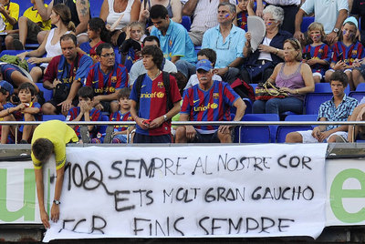 En un Camp Nou lleno hasta la bandera y con la excusa de la disputa de la 45 edición del Joan Gamper contra el Milan, Jaime Lissavetzky, secretario de Estado para el deporte, y Angel María Villar, presidente de la Federación, entregaron al Barcelona el trofeo de Liga conquistado la pasada temporada. El ex presidente Joan Laporta, que aceptó la invitación del actual (Sandro Rosell) a asistir al evento, dio la vuelta olímpica al terreno de juego. Le convidó el capitán Puyol y Laporta aceptó honrado. Rosell prefirió retirarse al palco y dejar el momento de gloria a su antecesor.
