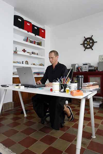 El dramaturgo y novelista Antonio Álamo (Córdoba, 1964) vive en una casa en pleno barrio sevillano de La Macarena desde hace siete años. Su despacho ocupa el tercer piso. Es una estancia amplia con una mesa de trabajo, una cama, un sofá y estanterías con libros, carpetas y discos. "Este es el despacho donde escribo habitualmente. También hago escapadas fuera de Sevilla. De pronto, me voy al mar o al campo una semanita a trabajar y me aíslo. Estoy casi acostumbrado a escribir en cualquier lugar. Las ideas me asaltan y puedo tomar anotaciones en un bar, en un aeropuerto...", explica Álamo, que estrena hoy Veinticinco años menos un día en el Teatro Español de Madrid. "Es la comedia más comedia que he escrito nunca. Tiene una cierta complejidad estructural, puesto que contiene varias obras en su interior. Trata del hastío matrimonial. Hay un triángulo amoroso. También trata sobre el mundo del teatro y los actores", comenta el autor, entre cuyas obras teatrales destaca Caos y la trilogía formada por Los borrachos, Los enfermos y Yo Satán.