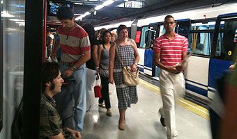 El tren de la línea 8 que viene del aeropuerto se vacía en Nuevos Ministerios, última parada. Pero la gente del andén no cabe, porque siguen llegando usuarios. Las puertas se abren y se cierran, y el metro tarda varios minutos en partir.