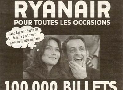 "Con Ryanair, toda mi familia puede venir a mi boda", piensa Carla Bruni con la cabeza reposando sobre el hombro de su prometido Nicolás Sarkozy, el Presidente de Francia. Así presenta a la pareja presidencial el anuncio que la compañía aérea de bajo costo Ryanair insertó ésta mañana en el diario francés, Le Parisien.