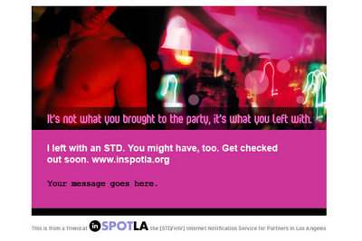 Las personas infectadas con alguna enfermedad de transmisión sexual podrán advertir anónimamente a sus ex parejas gracias a un nuevo sitio en Internet lanzado por un condado de Los Ángeles. El sitio, iniciativa de la Fundación para el tratamiento del Sida (AHF en sus siglas en inglés), ofrece varios modelos de correo electrónico con textos como el siguiente: "Debo decirte una cosa... he descubierto que poseo una enfermedad de transmisión sexual. Si no te has realizado ninguna prueba recientemente, deberías".