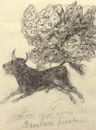 El boceto de Goya, que muestra un toro suspendido en el aire por mariposas con rostros grotescos, data de la época en la que el genio español se exilió voluntariamente en Burdeos (Francia), al final de su vida. "Demuestra una sensibilidad tan moderna, tan cercana al surrealismo Es un dibujo excepcional, y las obras excepcionales deben alcanzar precios extraordinarios", asegura el especialista William O''Really.